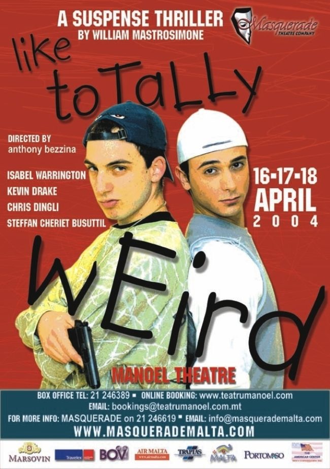 Like Totally Weird is William Mastrosimone's suspenseful, darkly comical drama about two teen-age boys who kidnap a famous Hollywood producer and his girlfriend while acting out violent scenes from movies that he produced. Like Totally Weird examines the effect of gratuitous cinema violence on young people. It uses humour to expose taboos and allows people to laugh at uncomfortable or awkward situations that they normally shy away from.