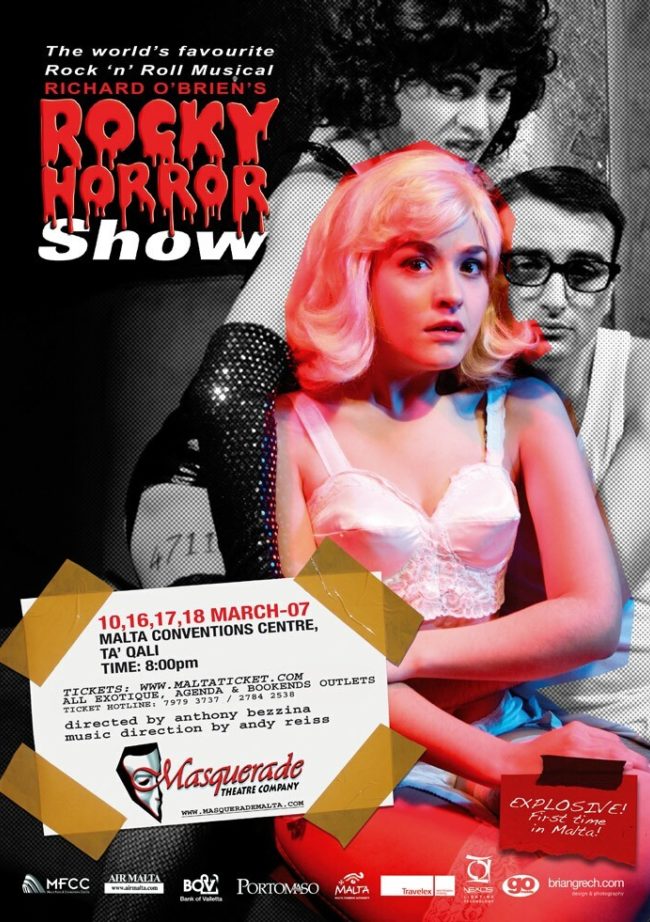 THE ROCKY HORROR SHOW is being supported by Bank of Valletta, Go Mobile, Portomaso, MTA, Air Malta, Travelex Financial Services, Nexos Lighting Technology, and Showmix.