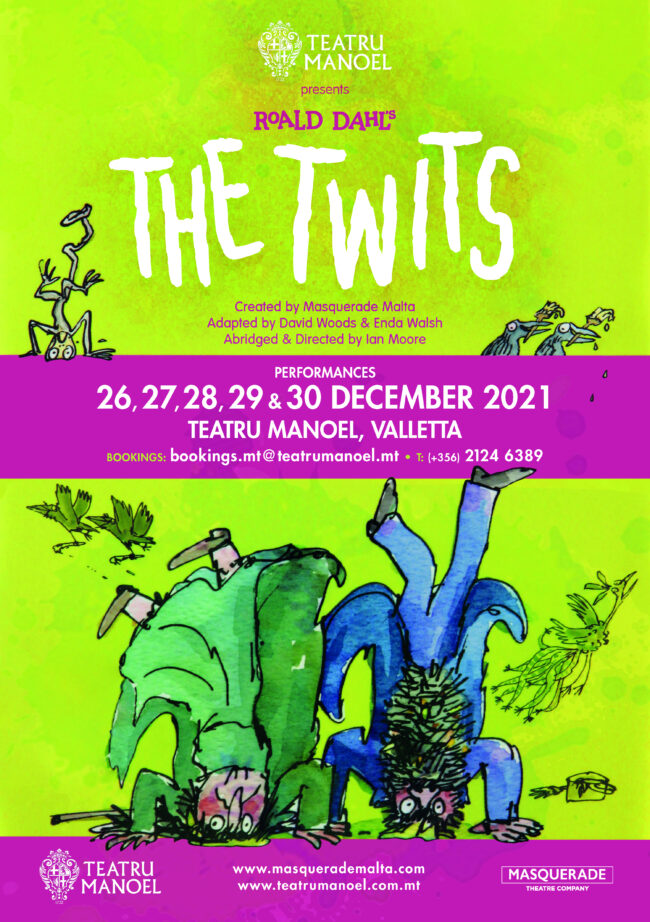 Mr and Mrs Twit are not very nice. In fact, they’re extremely unpleasant. They’re nasty to each other, and they’re VILE to everyone else. They hold the Muggle-Wumps, a family of monkeys, hostage in a cage and force them to stand on their heads. ALL THE TIME. We told you they weren’t very nice. Can the Muggle-Wumps find a way to teach those vicious Twits a lesson in how to be nice? In David Wood's mischievous adaptation of Roald Dahl’s story, Ian Moore turns The Twits upside down in this Masquerade Malta and Teatru Manoel co-production bringing this revolting revolution to the Manoel stage this Christmas.
